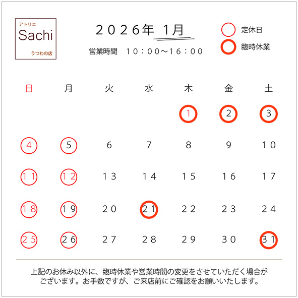 本年もご来店、お問い合わせいただき、ありがとうございました。 2025年の営業は12月26日(金)が最終日となります。 12月27日~1月5日は年末年始のお休みをいただき、 新年は1月6日(火)より営業いたします。